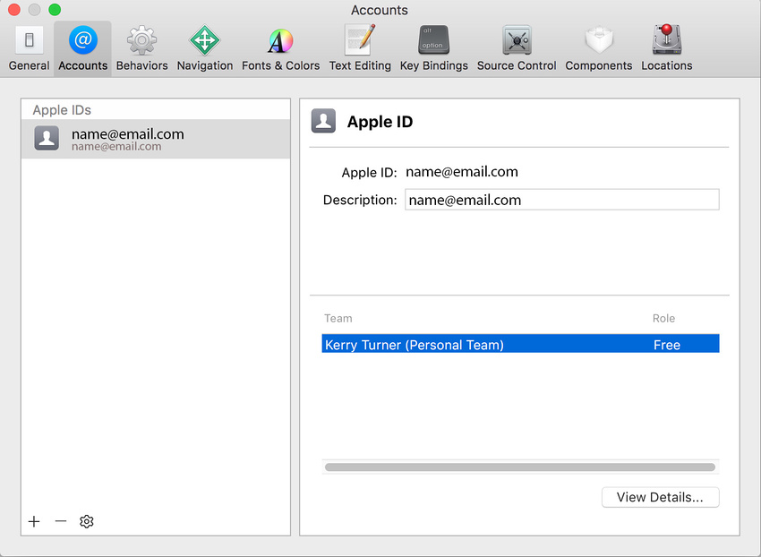3.选择窗口顶部的 Accounts 以显示有关已添加到 Xcode 的 Apple ID 的信息。