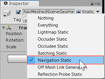 除了如上所述在 Navigation 窗口中将对象标记为 Navigation Static 之外,还可以使用 Inspector 顶部的 Static 菜单。如果刚好没有打开 Navigation 窗口,这会很方便。