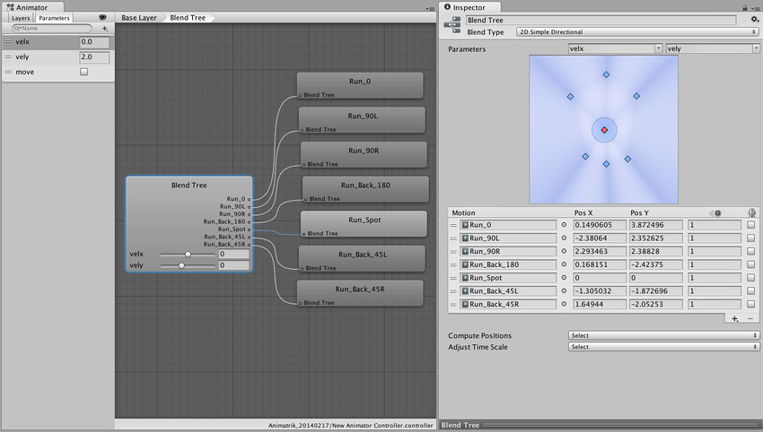 我们继续将扫射集组织在 2D 混合树中;选择混合类型:2D Simple Directional,并使用 Compute Positions > Velocity XZ 放置动画