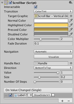 On Value Changed 滚动条的当前值发生变化时调用的 UnityEvent。该事件可将值作为 float 类型动态参数发送。