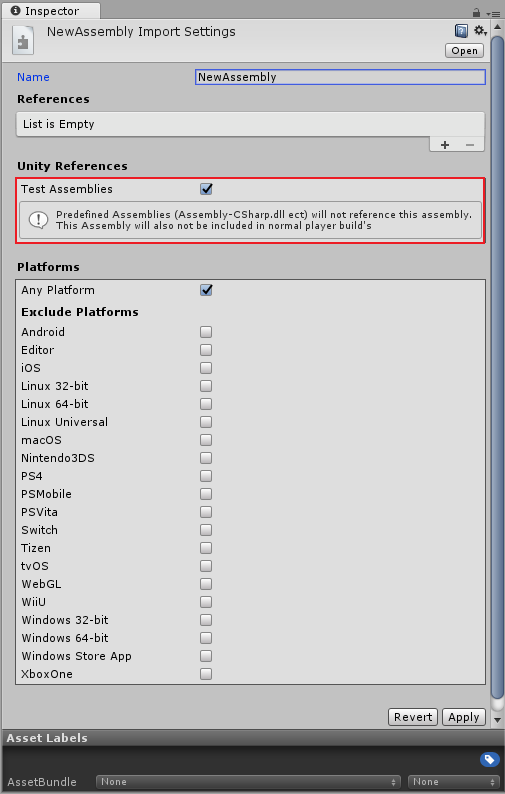 Assembly Definition file that references test assemblies that are Editor-only