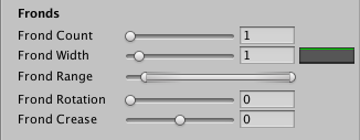 此处可调整树叶的数量及其属性。此选项卡仅在 Geometry 选项卡中启用了 Frond 几何体时才可用。