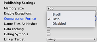 如果要构建发布版本,Unity 将根据在 WebGL Player 设置的 Publishing Settings 面板中选择的 Compression Format 来压缩构建输出文件。