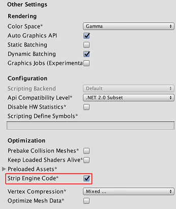 默认情况下,Unity 会从构建中删除所有未使用的代码。可通过 Player 设置(菜单:__Edit__ > Project Settings__,然后选择 Player__ 类别)来更改此设置:选择 Other Settings 面板访问 Strip Engine Code 选项。最好在启用剥离的情况下进行构建。