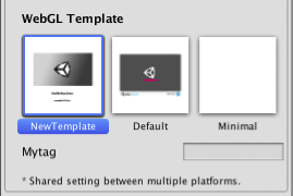 __UNITY_CUSTOM_SOME_TAG__:如果以 UNITY_CUSTOM_XXX 的形式向索引文件添加一个标签,则在选择模板后,此标签将显示在 Player 设置中。例如,如果向源代码添加 &lt;title>Unity Player | %UNITY_CUSTOM_MYTAG%</title>,Player 设置将如下所示: