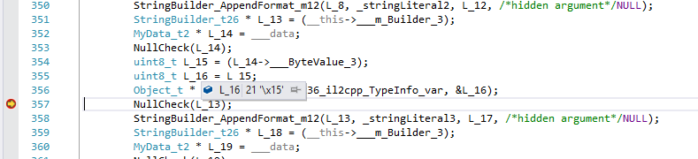 IL2CPP 方法如下所示:<ClassName>_<MethodName>_m#number,其中的 <ClassName> 是声明类型的方法的普通类名,<MethodName> 是普通方法名称,而 #number 是唯一的方法编号。例如: