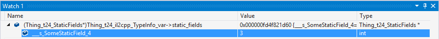 观察静态字段有点困难。在 IL2CPP 中,静态字段存储在 Il2CppClass 实例本身上。因此,为了观察静态字段,我们首先需要一个指向该类型 Il2CppClass 结构的指针。这些指针位于使用它们的方法的作用域内,但在观察一次之后,指针将在应用程序运行期间保持在相同的内存地址。Il2CppClass 结构具有“static_fields”字段,该字段便是一个指针,指向包含该特定类型的静态字段的内存块。要查看实际值,必须将此指针强制转换为适当的静态字段结构:每种类型都有自己的字段。例如,我们来观察 Thing_t24 类的静态字段: