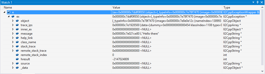 IL2CPP 使用本机 C++ 异常来实现 .NET 异常。当应该抛出某种异常时,IL2CPP 将抛出 Il2CppExceptionWrapper 对象,其定义如下: