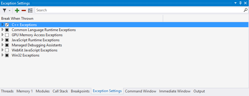 最后,对异常启用调试器中断,从而能够当场捕获异常的来源,这样可能有助于发现问题。为此,请在 Visual Studio 中按 CTRL+ALT+E,并确保在打开的窗口中选中了 C++ Exceptions 复选框: