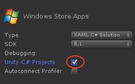 • 以通用 Windows 平台为目标进行构建时,选中 Unity C# projects