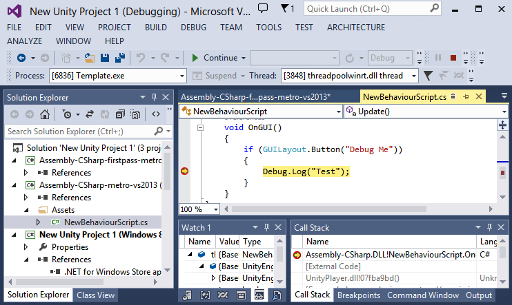 注意:通用 Windows 平台与 Microsoft .NET 一起运行,这就是为什么无法使用 MonoDevelop 来调试脚本,而必须使用 Visual Studio 2013。