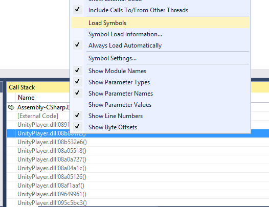 假设在 Unity 引擎中遇到崩溃并触发断点(注意:如果通过 Debug > Exceptions 菜单启用所有异常,Visual Studio 可在崩溃时停止),选择 Debug > Windows > Call Stack,随后应该会打开 Call Stack 窗口,如果不能看到 UnityPlayer.dll 中的函数名称,这意味着未加载符号,要修复该问题,右键单击该功能并选择 Load Symbols,UnityPlayer.pdb 文件将位于 [项目路径]>\Players\[Windows80 或 Windows81]\[X86 或 ARM 或 X64]\debug。