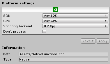 可以将 C++ (.cpp) 代码文件直接添加到 Unity 项目中作为 Plugin Inspector 中的插件。如果配置为与通用 Windows 平台和 IL2CPP 脚本后端兼容,这些 C++ 文件将与从托管程序集生成的 C++ 代码一起编译: