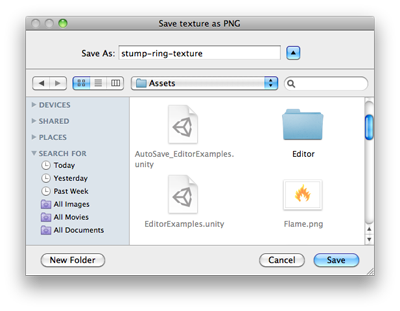 var path = EditorUtility.SaveFilePanel( "Save texture as PNG", "", texture.name + ".png", "png");