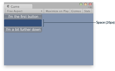 // Insert 20 pixels of space between the 2 buttons. GUILayout.Space(20);